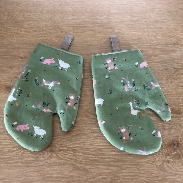 Passend zu dieser Kochschürze gibt es auch kleine Kinderhandschuhe. Die Kinderhandschuhe sind aus Baumwollstoff. Sie sind nur zum Spielen gedacht. Denn das eingearbeitete Vlies F640 schützt nicht vor Hitze. Am oberen Rand befindet sich eine kleine Schlaufe zum Aufhängen.